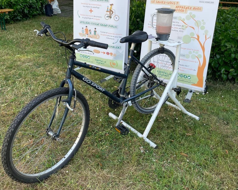 Réalisation de smoothie Anti-Gaspi, grace au Vélo ludique et autonome sur notre stand de sensibilisation aux enjeux du gaspillage alimentaire.